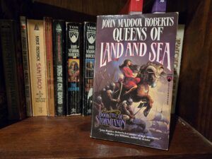 The Queens of Land and Sea is the fifth — and, unfortunately, final — volume of John Maddox Roberts The Stormlands series. While one of the early chapters adds a trifle to the travelogue of Roberts’ distant future Earth, this book offers a great deal less world building than the previous four. It does open up the possibility of future exploration by revealing a South American civilization, one possessed of naval technology exceeding that of North America — and also one bringing a contagion to which most of the North American’s do not possess a natural immunity, with calamitous consequences.
